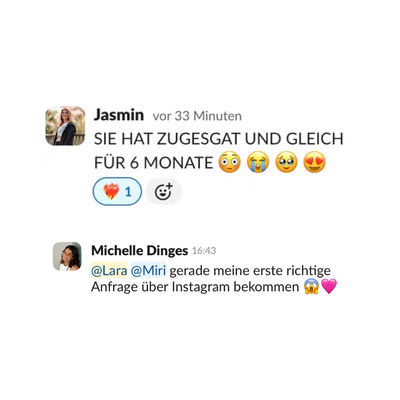 Wir legen sehr viel Wert auf die engmaschige 1:1 Begleitung: 2:1 On-Boarding, 6 Live Calls, Slack-Channel, Feedback-Schleifen, regelmäßige Strategie-Gespräche & 24/7 Zugang zu unseren Ki-Zwillingen (ab April)